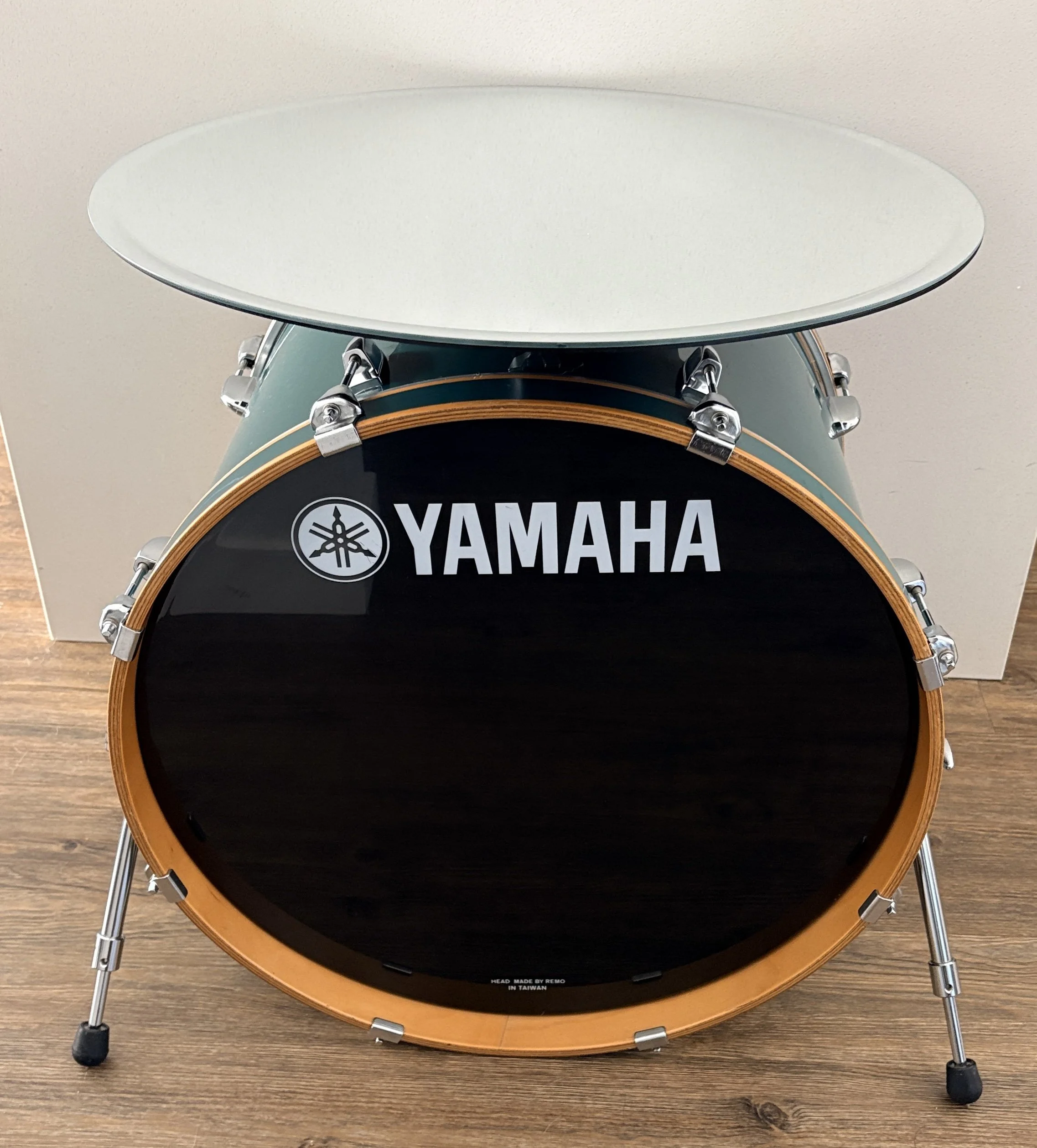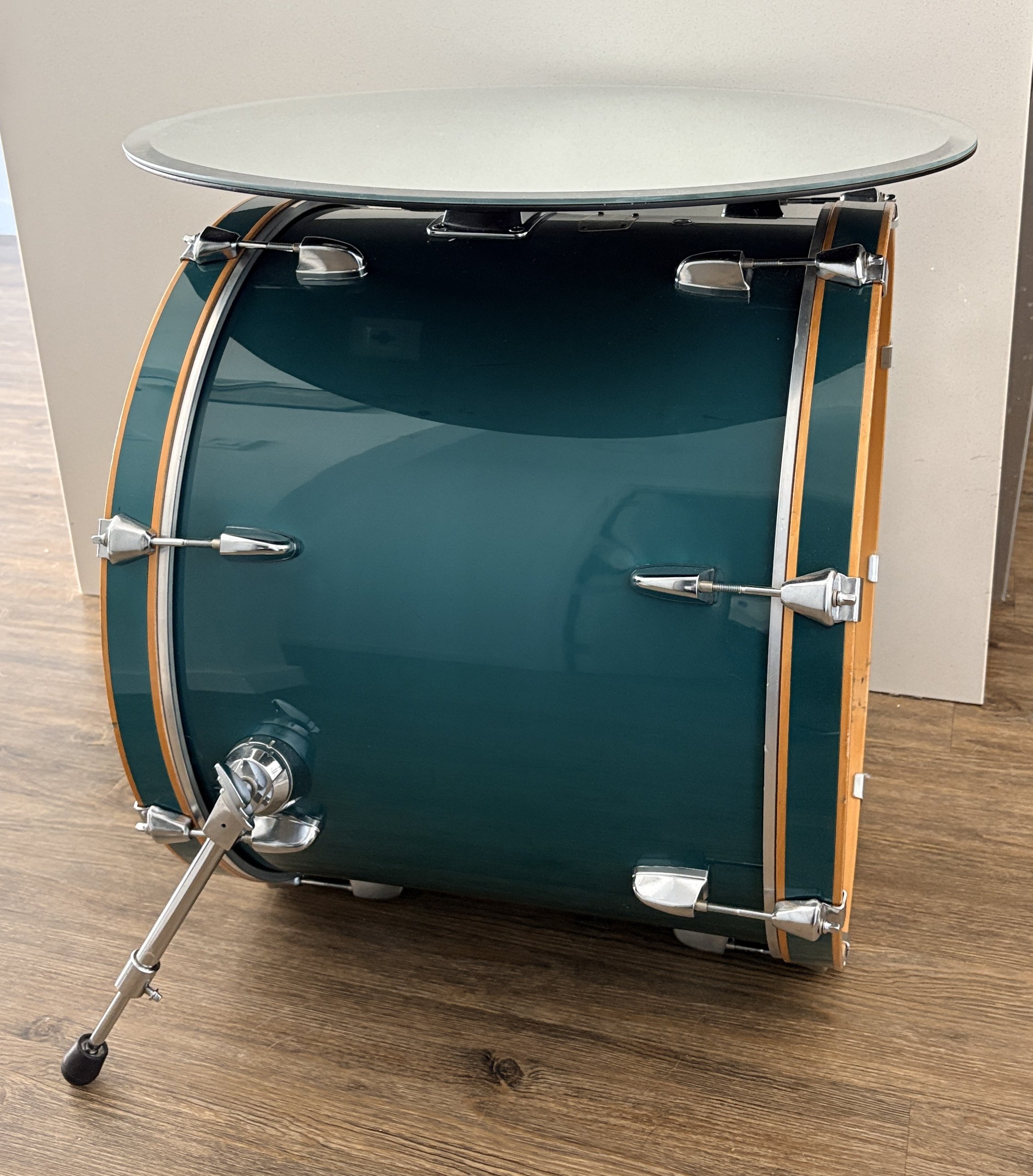 A used kick drum is repurposed as a table, its mirrored surface returning the viewer’s gaze. The work transforms a tool of performance into an object of quiet presence, where sound persists only as memory.
