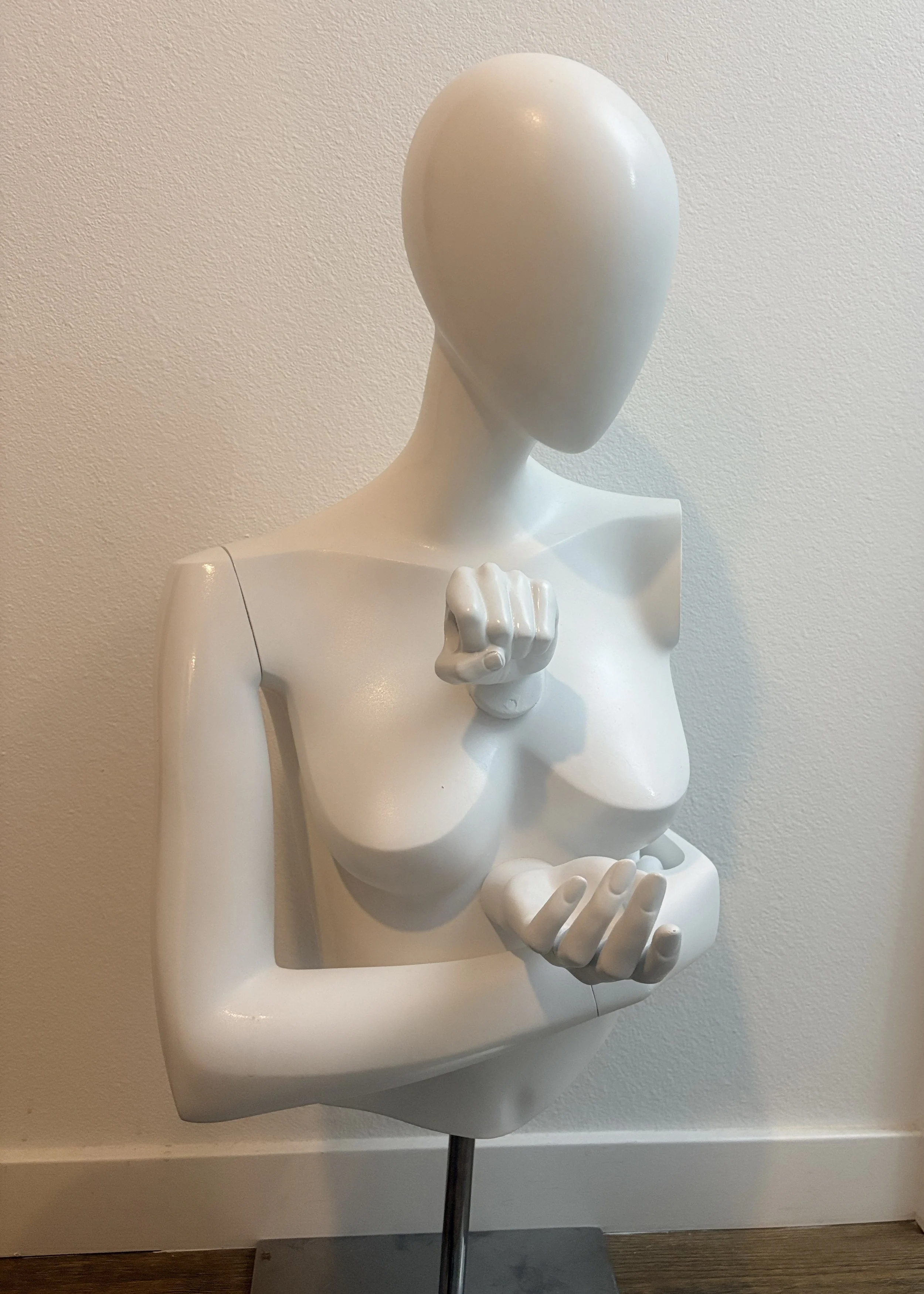 The opposing forms suggest tension between protection and offering, resistance and vulnerability. The work holds both impulses at once, revealing the body not as a stable form, but as a space where contradictory forces coexist.