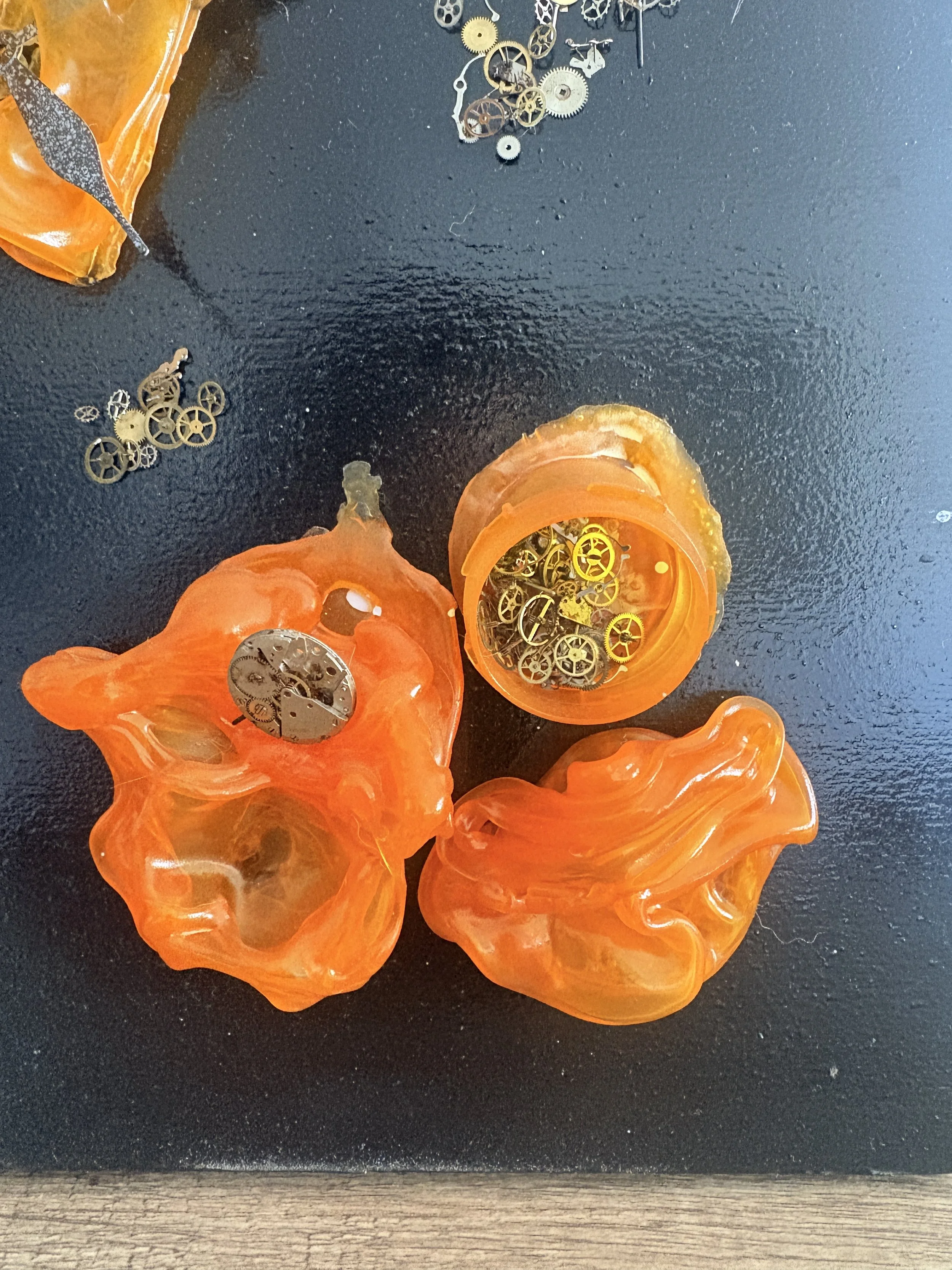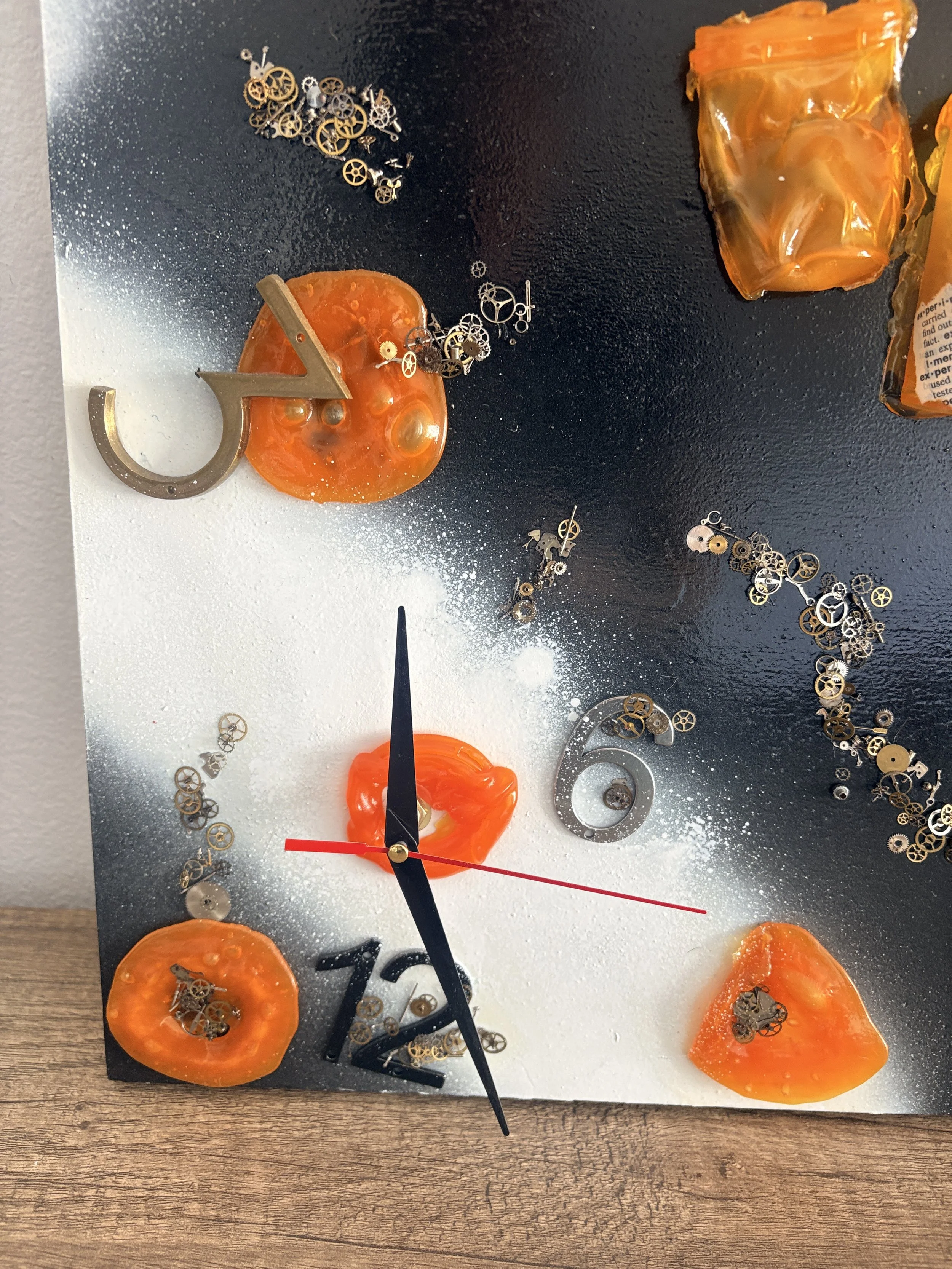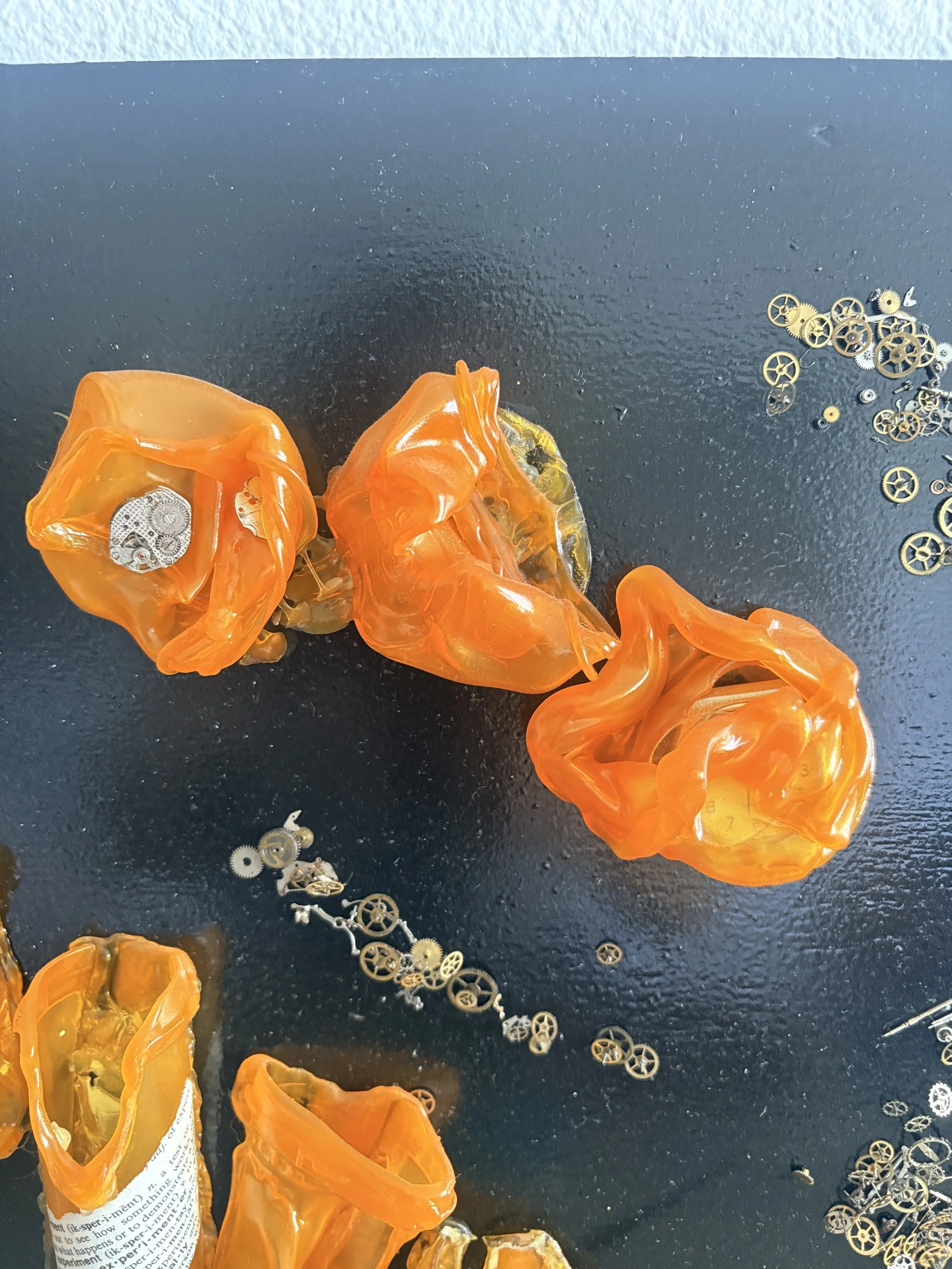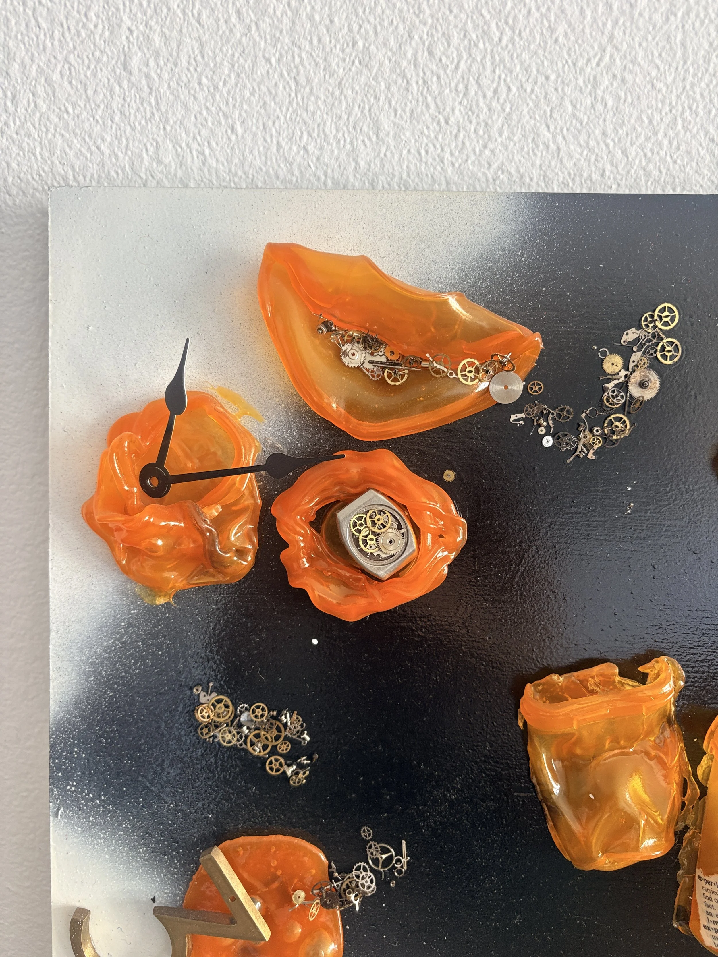 Composed of melted prescription bottles and fractured watch parts, this piece holds the physical evidence of what trauma can cost—measured in years, in delays, in time miscounted and redirected.