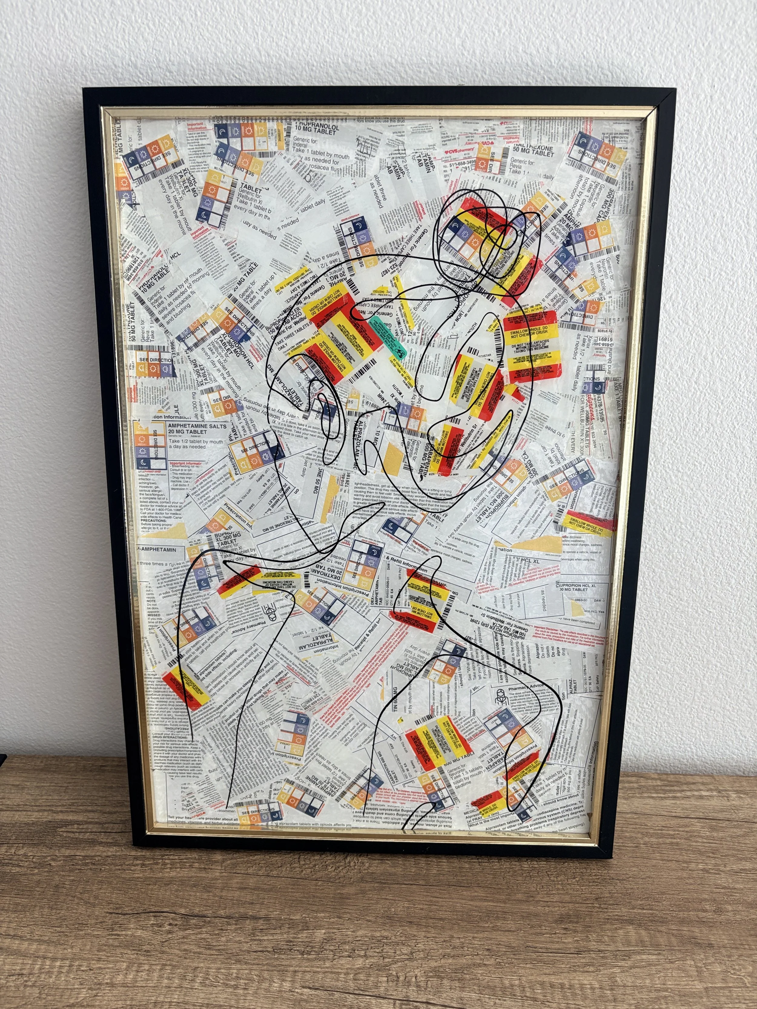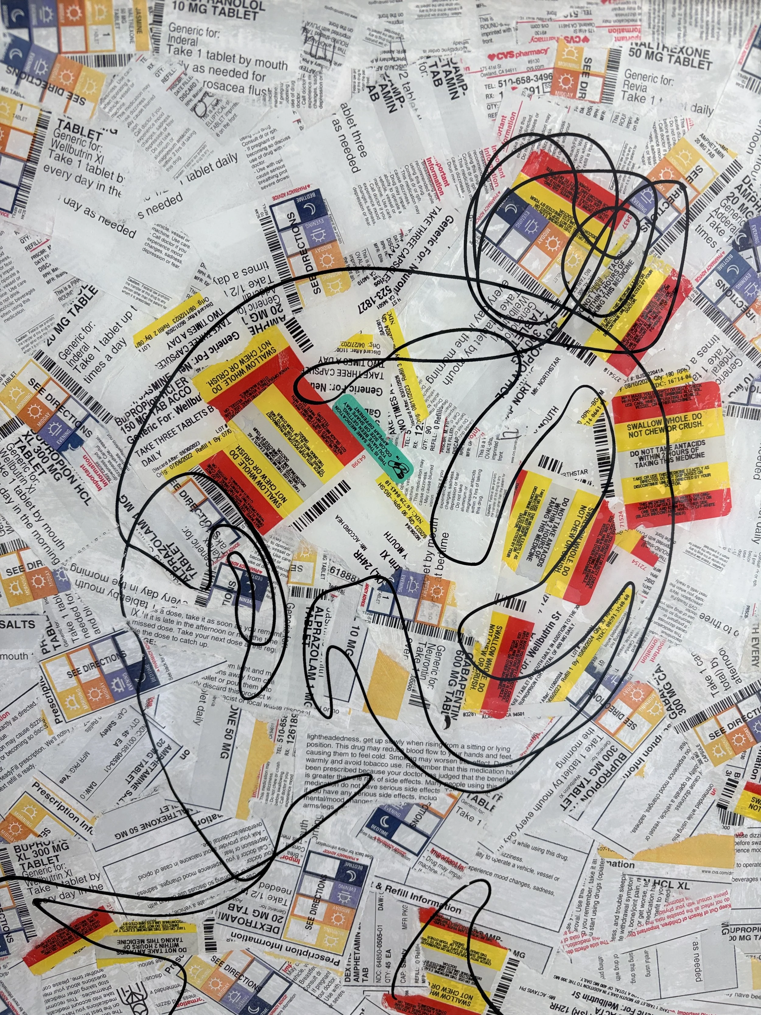 A woman’s outline surfaces from a field of prescription labels—dosages, warnings, and directives layered until instruction becomes a body.